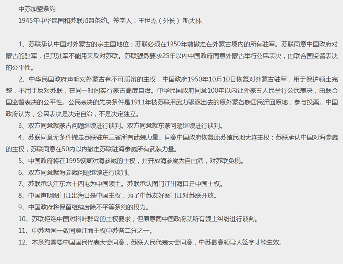 苏联愉快无条目撤走苏联驻东三省通盘武装力量。愉快中国政府恢回答苏隶属国大连主权;苏联承认中国对海参崴的主权,苏联愉快在50年以内撤走苏联驻海参崴通盘武装力量。中国政府将在1995回答对海参崴的主权,并绽开海参崴为解放港,对苏联免税。