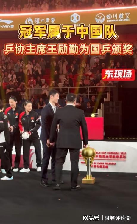 王励勤在受奖庆典上,以中国乒协主席身份发祯祥物,和老队友马琳、王皓抓手互动,再现“二王一马”时间三东谈主同框画面。